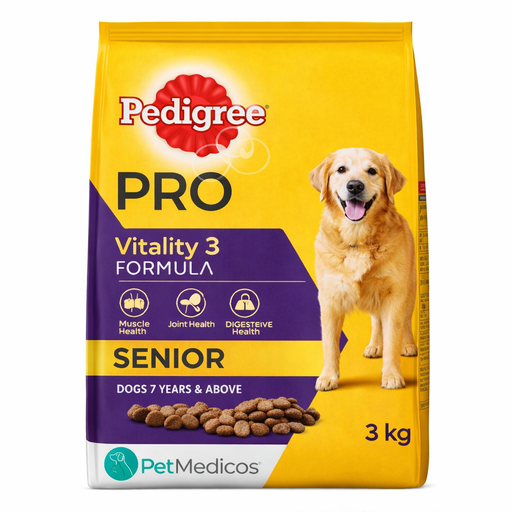 Pedigree PRO Vitality 3 Formula Senior Dry Dog Food is specially developed for senior dogs aged 7 years and above. It contains a scientifically balanced blend of high-quality protein, antioxidants, and joint-supporting nutrients to maintain overall vitality and active ageing.